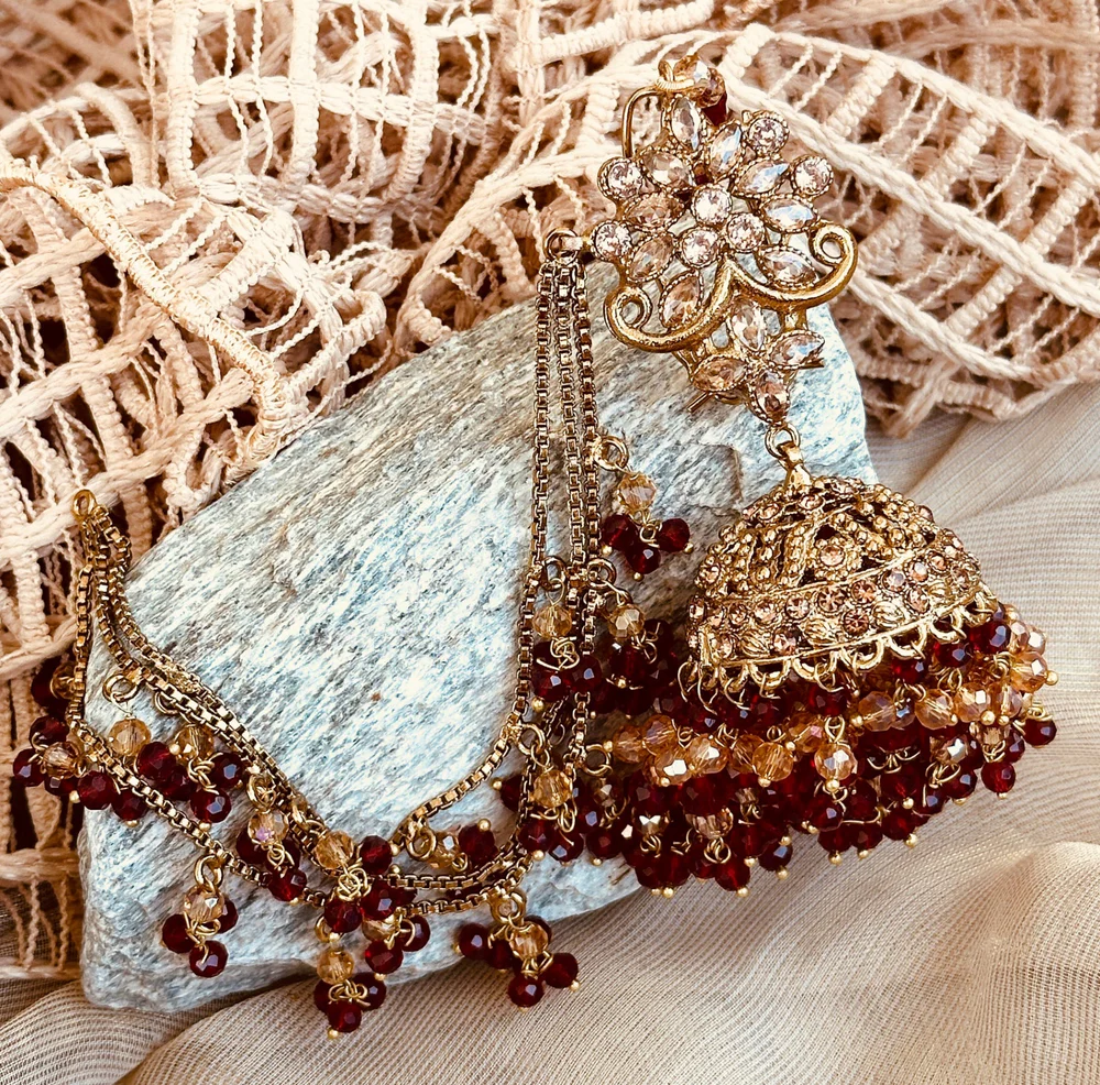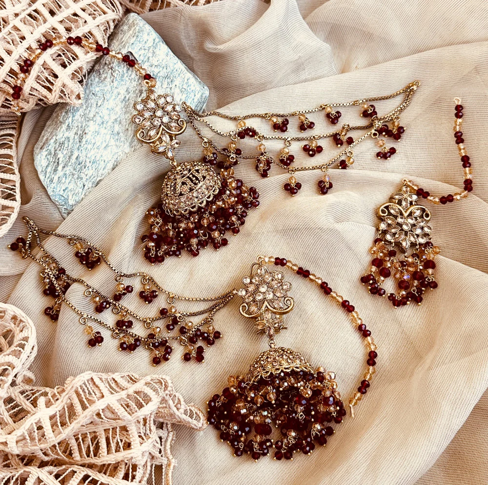 A regal statement of tradition, this maroon Jhumki Tikka is adorned with intricate detailing and deep ruby tones that bring out a royal bridal charm. Perfect for weddings and festive occasions where elegance meets heritage.